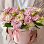 На фото композиция 11 розовых эустом в коробке. В составе: эустома (лизиантус) 11 шт, рускус 5 шт, оазис флористический 1 шт, шляпная коробка (m) 1 шт, атласная лента 1 шт, . Все цветы свежие и ароматные, букет красиво оформлен и отлично подходит для подарка. Доступна доставка цветов или самовывоз.