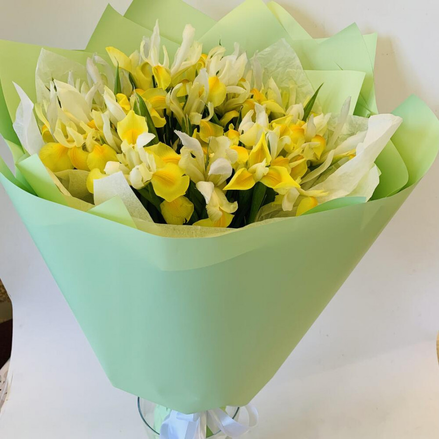 На фото букет из 49 желтых ирисов. В составе: ирис 49 шт, дизайнерская упаковка 1 шт, брасика 1 шт, . Все цветы свежие и ароматные, букет красиво оформлен и отлично подходит для подарка. Доступна доставка цветов или самовывоз.
