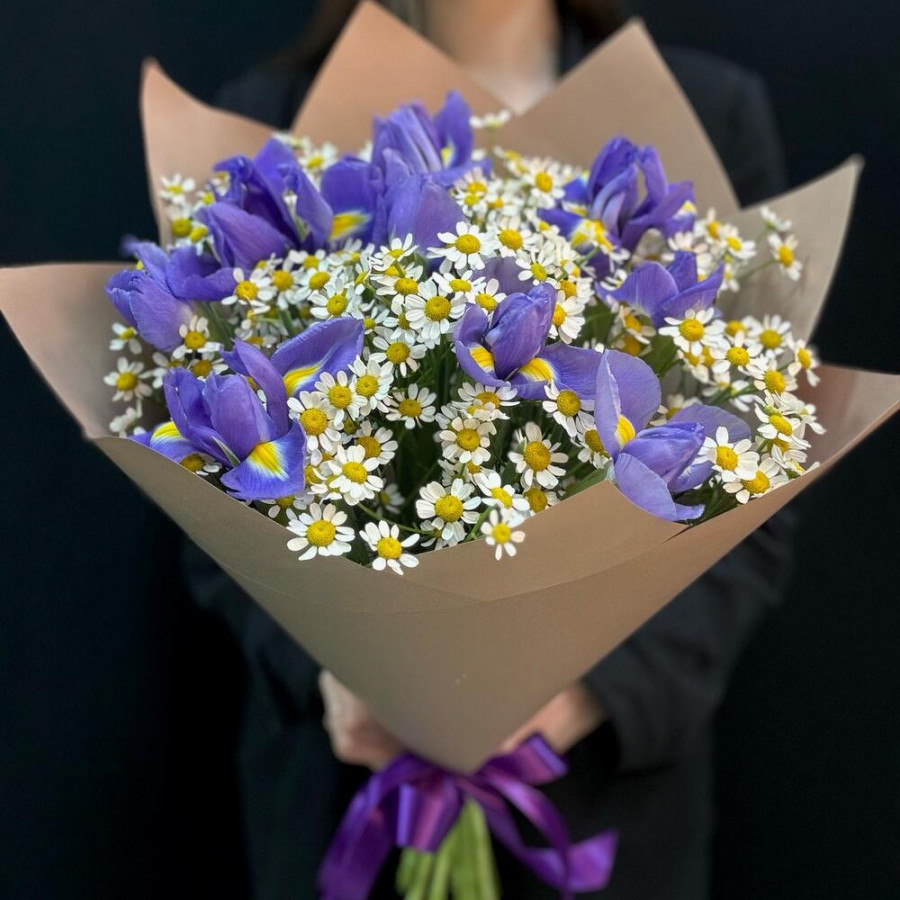 На фото букет из синих ирисов и танацетума. В составе: ирис 9 шт, танацетум 6 шт, крафт-бумага 1 шт, атласная лента 1 шт, . Все цветы свежие и ароматные, букет красиво оформлен и отлично подходит для подарка. Доступна доставка цветов или самовывоз.